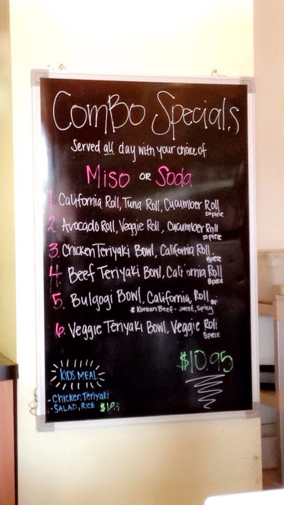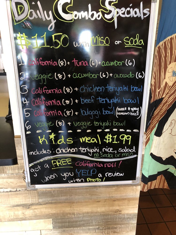 Tempura or beef teriyaki, California roll, chicken katsu, chicken teriyaki, 3 bowls of rice, 3 hand rolls or 3 miso soup or salad.