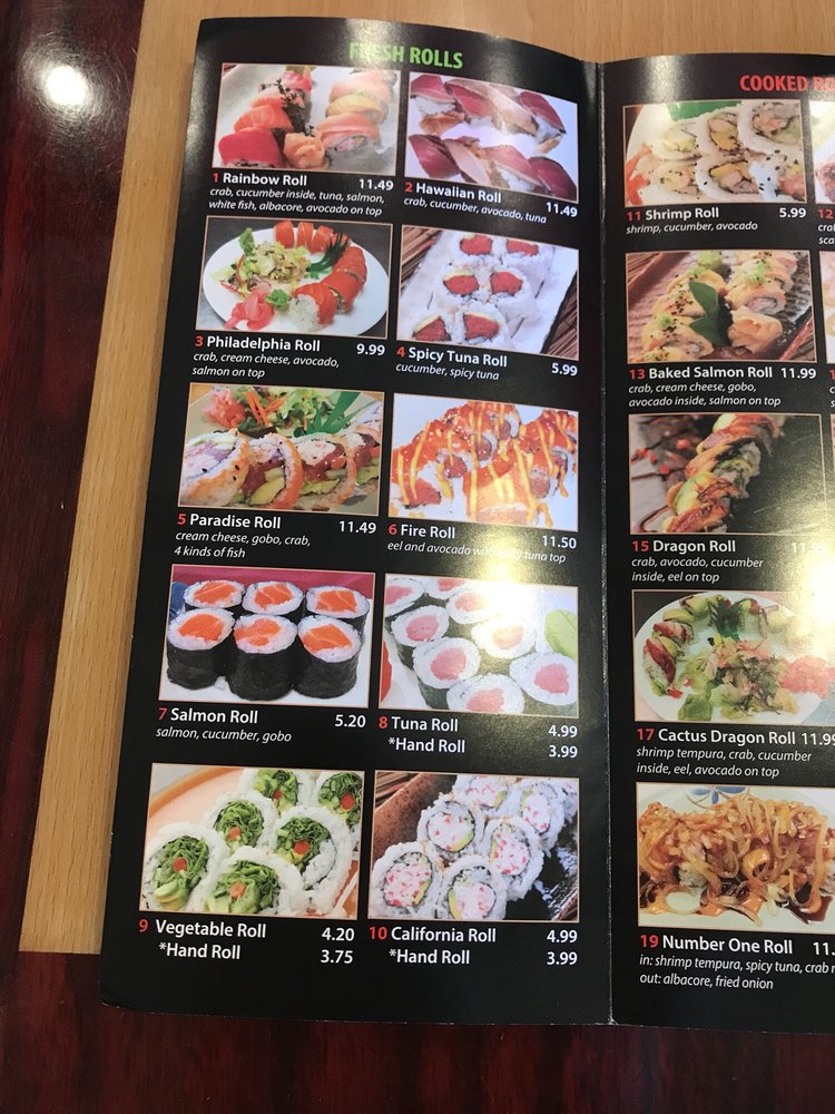 In: shrimp tempura, crab, avocado, cucumber. Top: spicy tuna, albacore, fried onion.